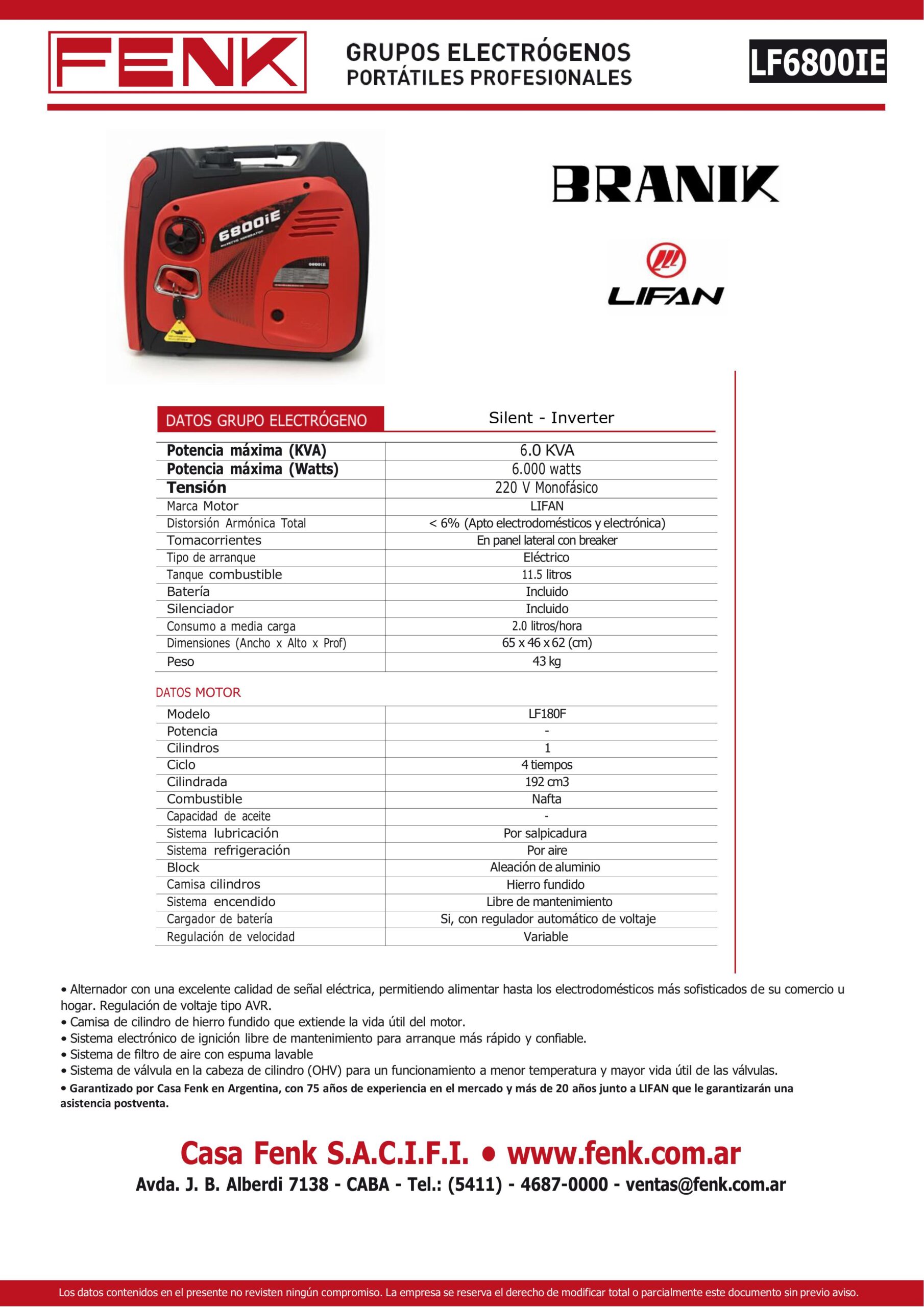 | 144.61 | BRANIK 6800iE | INVERTER | 6000W | 230V | MAN/ELECT | 1 | 192CC | 11.5LTS | 650*460*620MM | 43KG |